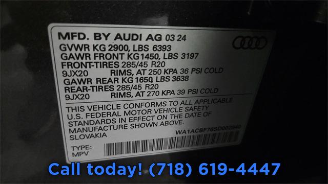Navigation system: Audi MMI Navigation plus with Touch Response, Convenience Package (DISC), 10 Speakers, AM/FM radio: SiriusXM w/ 360L, Radio data system, Radio: Audi Sound System, Air Conditioning, Automatic temperature control, Front dual zone A/C, Rear air conditioning, Rear window defroster, Memory seat, Power driver seat, Power steering, Power windows, Remote keyless entry, Steering wheel memory, Steering wheel mounted audio controls, Four wheel independent suspension, Speed-sensing steering, Traction control, 4-Wheel Disc Brakes, ABS brakes, Dual front impact airbags, Dual front side impact airbags, Emergency communication system: Audi connect CARE, Front anti-roll bar, Low tire pressure warning, Occupant sensing airbag, Overhead airbag, Rear anti-roll bar, Rear side impact airbag, Power moonroof: Panoramic, Power Liftgate, Brake assist, Electronic Stability Control, Exterior Parking Camera Rear, Auto High-beam Headlights, Delay-off headlights, Front fog lights, Fully automatic headlights, Rear fog lights, Panic alarm, Security system, Speed control, Auto-dimming door mirrors, Bumpers: body-color, Heated door mirrors, Power door mirrors, Spoiler, Turn signal indicator mirrors, Audi Beam Rings, Auto-dimming Rear-View mirror, Compass, Driver door bin, Driver vanity mirror, Front reading lights, Garage door transmitter: HomeLink, Genuine wood door panel insert, Heated Steering Wheel, Illuminated entry, Leather Shift Knob, Leather steering wheel, Outside temperature display, Overhead console, Passenger vanity mirror, Rear reading lights, Rear seat center armrest, Tachometer, Telescoping steering wheel, Tilt steering wheel, Top View Camera System, Trip computer, Wireless Phone Charging Pad, 3rd row seats: bench, Front Bucket Seats, Front Center Armrest, Heated Front Bucket Seats, Heated front seats, Leather Seating Surfaces, Power passenger seat, Reclining 3rd row seat, Split folding rear seat, Passenger door bin, Privacy Trunk Cover, Alloy wheels, Wheels: 19" 5-Arm-Star Design, Wheels: 20" 5-Double-Spoke, Rain sensing wipers, Rear window wiper, Variably intermittent wipers