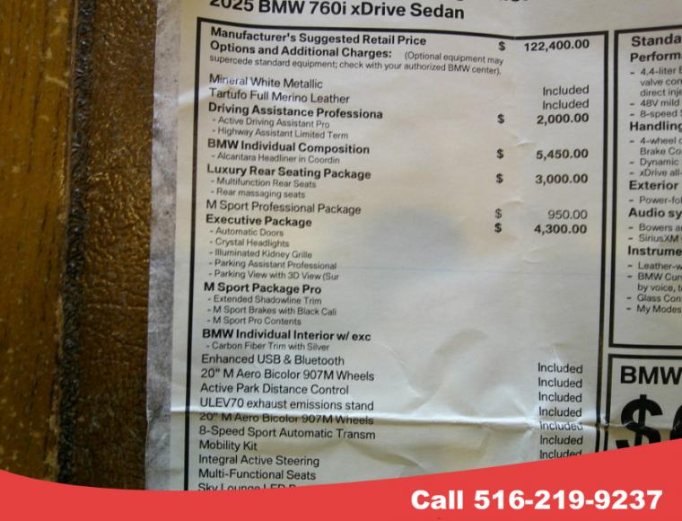 For more information on this 2025 BMW 760i, please call South Shore Auto Brokers at (516) 219-9237 or with the contact form on this page. This vehicle's vin number is WBA33EJ04SCU80929 and is recorded as being in stock at South Shore Auto Brokers at 104 Stone Blvd in Massapequa. See all cars from this dealership.