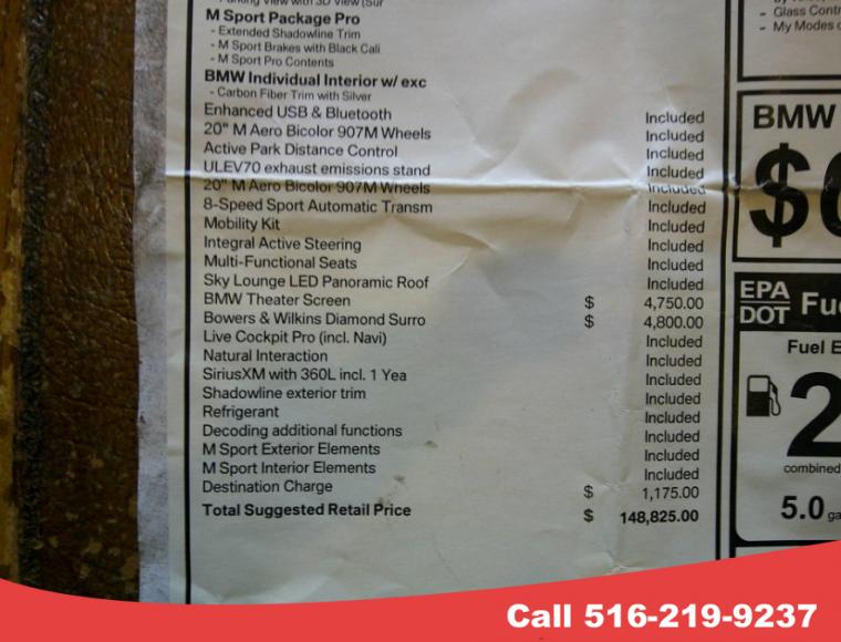ABS, 4-Wheel Disc Brakes, 8 Cylinder Engine, 8-Speed A/T, A/C, A/T, Active Suspension, Adjustable Steering Wheel, Air Suspension, Security System, All Wheel Drive, Aluminum Wheels, AM/FM Stereo, Transmission w/Dual Shift Mode, Automatic Headlights, Automatic Highbeams, Automatic Parking, Auxiliary Audio Input, Back-Up Camera, Blind Spot Monitor, Brake Assist, Bucket Seats, Child Safety Locks, Climate Control, Cooled Front Seat(s), Cross-Traffic Alert, Cruise Control, Daytime Running Lights, Driver Air Bag, Driver Illuminated Vanity Mirror, Driver Adjustable Lumbar, Driver Monitoring, Driver Vanity Mirror, Multi-Zone A/C, Auto-Dimming Rearview Mirror, Stability Control, Front Collision Mitigation, Floor Mats, Gasoline/Mild Electric Hybrid, Hands-Free Liftgate, HD Radio, Headlights-Auto-Leveling, Heads-Up Display, Heated Front Seat(s), Heated Mirrors, Heated Rear Seat(s), Heated Steering Wheel, Intermittent Wipers, Keyless Entry, Keyless Start, Lane Departure Warning, Lane Keeping Assist, Leather Steering Wheel, LED Headlights, Lithium Ion Traction Battery, Mirror Memory, MP3 Capability, Navigation System, Telematics, Panoramic Roof, Pass-Through Rear Seat, Passenger Air Bag, Passenger Air Bag Sensor, Passenger Illuminated Visor Mirror, Passenger Adjustable Lumbar, Passenger Vanity Mirror, Power Door Locks, Power Mirror(s), Power Driver Seat, Power Folding Mirrors, Power Liftgate, Power Passenger Seat, Power Steering, Power Windows, Premium Sound System, Rain Sensing Wipers, Rear A/C, Rear Bench Seat, Rear Collision Mitigation, Rear Defrost, Rear Head Air Bag, Rear Parking Aid, Rear Seat Audio Controls, Remote Engine Start, Remote Trunk Release, Requires Subscription, Satellite Radio, Seat Memory, Seat-Massage, Front Side Air Bag, Front Head Air Bag, Smart Device Integration, Steering Wheel Audio Controls, Generic Sun/Moonroof, Tire Pressure Monitor, Tires - Front Performance, Tires - Rear Performance, Traction Control, Trip Computer, Turbocharged, Universal Garage Door Opener, Variable Speed Intermittent Wipers, Immobilizer, WiFi Hotspot, Bluetooth Connection, Auto On/Off Projector Beam Led Low/High Beam Auto-Leveling Directionally Adaptive Auto High-Beam Daytime Running Lights Preference Setting Headlamps w/Delay-Off, Black Door Handles, Black Side Windows Trim, Body-Colored Front Bumper w/Black Bumper Insert, Body-Colored Power Heated Side Mirrors w/Driver Auto Dimming and Power Folding, Body-Colored Rear Bumper w/Black Rub Strip/Fascia Accent, Chrome Grille, Cornering Lights, Fixed Glass Panoramic Sky Lounge LED Roof 1st And 2nd Row Sunroof w/Power Sunshade, Fixed Rear Window w/Defroster and Power Blind, Galvanized Steel/Aluminum Panels, Headlights-Automatic Highbeams, LED Brakelights, Light Tinted Glass, Perimeter/Approach Lights, Power Trunk Rear Cargo Access, Soft Close Doors, Speed Sensitive Rain Detecting Variable Intermittent Wipers w/Heated Jets, Tire Mobility Kit, Tires: 255/45R20 Fr & 285/40R20 Rr Staggered AS, Wheels: 20" M Aero Bicolor Style 907M -inc: 20" x 9.0" front and 20" x 10.5" rear, 1 12V DC Power Outlet, 18-Way Power Driver Seat -inc: Power Recline, Height Adjustment, Cushion Extension, Seatback Side Bolster Support, Fore/Aft Movement, Cushion Tilt, Articulating Upper Backrest, Power 4-Way Lumbar Support and Massage, 18-Way Power Passenger Seat -inc: Power Recline, Height Adjustment, Seatback Side Bolster Support, Fore/Aft Movement, Cushion Extension, Cushion Tilt, Articulating Upper Backrest, Power 4-Way Lumbar Support and Massage, 2 Seatback Storage Pockets, Air Filtration, Apple CarPlay & Android Auto Compatibility, Bench Front Facing Heated Rear Seat, BMW Maps Navigation Integrated Navigation System w/Voice Activation, Cargo Area Concealed Storage, Cargo Features -inc: Tire Mobility Kit, Cargo Space Lights, Carpet Floor Trim and Carpet Trunk Lid/Rear Cargo Door Trim, Connected Package Pro, ConnectedDrive Services, Cruise Control w/Steering Wheel Controls, Day-Night Auto-Dimming Rearview Mirror, Delayed Accessory Power, Digital/Analog Appearance, Driver / Passenger And Rear Door Bins, Driver And Passenger Visor Vanity Mirrors w/Driver And Passenger Illumination, Driver Foot Rest, Driver Information Center, Dual Zone Front And Rear Automatic Air Conditioning, Extended Merino Leather Upholstery w/VC, Includes BMW individual interior unless VCJL is ordered., Fade-To-Off Interior Lighting, FOB Controls -inc: Keyfob Cargo Access, Keyfob Window Activation and Keyfob Remote Start, Front And Rear Map Lights, Front Center Armrest and Rear Center Armrest w/Pass-Thru w/Storage, Front Cupholder, Front Seats w/Leather Back Material and Power 4-Way Driver Lumbar, Front Ventilated Seats, Full Carpet Floor Covering -inc: Carpet Front And Rear Floor Mats, Full Cloth Headliner, Full Floor Console w/Covered Storage, Mini Overhead Console and 1 12V DC Power Outlet, Garage Door Transmitter, Gauges -inc: Speedometer, Odometer, Engine Coolant Temp, Tachometer, Trip Odometer and Trip Computer, Glass/Metal-Look Gear Shifter Material, Head-Up Display, Heated Steering Wheel/Front & Rear Seats/Armrests, HVAC -inc: Underseat Ducts, Auxiliary Rear Heater, Headliner/Pillar Ducts and Console Ducts, Illuminated Locking Glove Box, Immobilizer, Interior Lock Disable, Interior Trim -inc: Piano Black/Metal-Look Door Panel Insert, Metal-Look Interior Accents and Veganza Leatherette Upholstered Dashboard, Leather Door Trim Insert, Live Cockpit Pro w/Navi, Memory Settings -inc: Driver And Passenger Seats, Door Mirrors, Steering Wheel and Head Restraints, Multi-Functional Seats, Natural Interaction, Outside Temp Gauge, Perimeter Alarm, Personal eSIM 5G, Power 1st Row Windows w/Front And Rear 1-Touch Up/Down, Power Anti-Whiplash w/Tilt Front Head Restraints and Manual Adjustable Rear Head Restraints, Power Door Locks w/Autolock Feature, Power Fuel Flap Locking Type, Power Rear Windows and w/Power 2nd Row Sun Blinds, Power Tilt/Telescoping Steering Column, Proximity Key For Doors And Push Button Start And