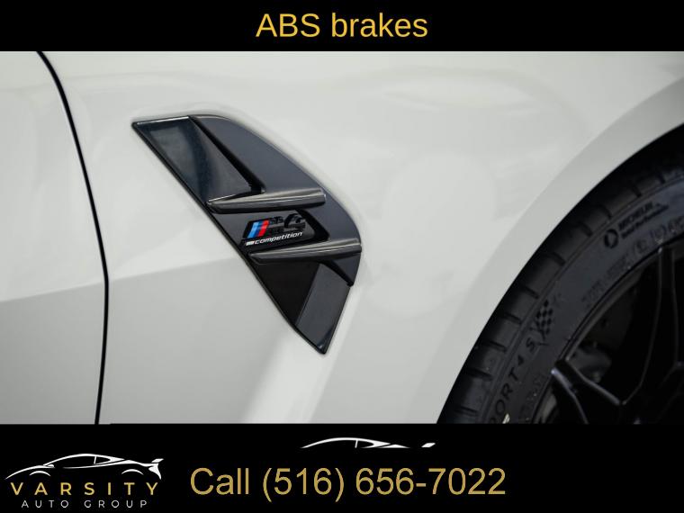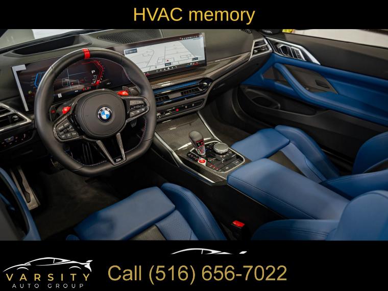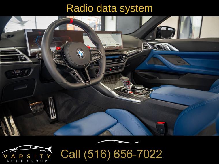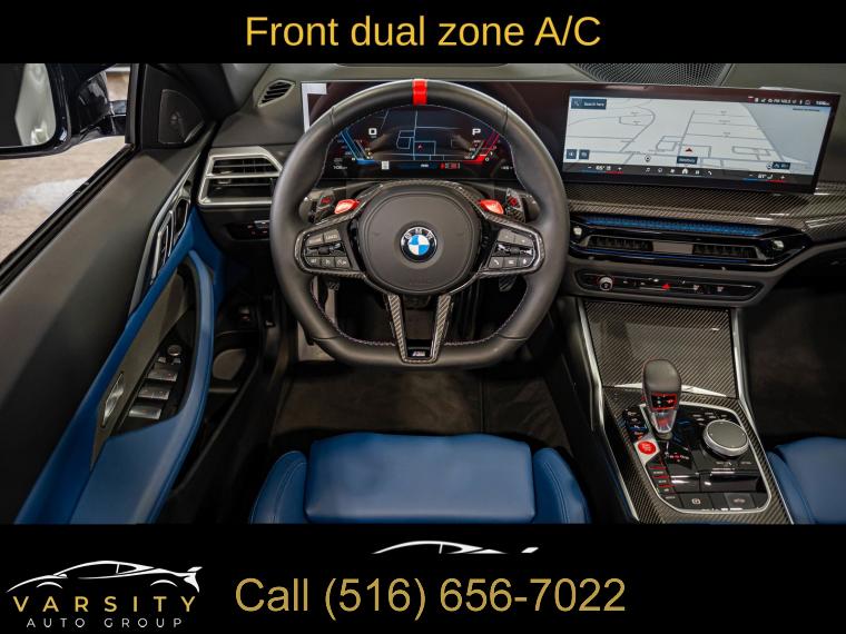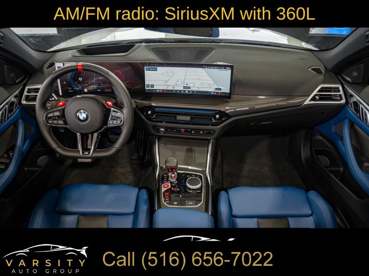 • Navigation, Navigation System, Connected Package Pro, Executive Package, Parking Assistance Package, 16 Speakers, AM/FM radio: SiriusXM with 360L, Audio memory, harman/kardon Surround Sound System, harman/kardonĀ® Speakers, Radio data system, Radio: AM/FM Audio System, SiriusXM w/360L, Air Conditioning, Automatic temperature control, Front dual zone A/C, HVAC memory, Rear window defroster, Lumbar Support, Memory seat, Power driver seat, Power steering, Power windows, Remote Engine Start, Remote keyless entry, Steering wheel mounted audio controls, Adaptive suspension, Four wheel independent suspension, Speed-sensing steering, Traction control, 4-Wheel Disc Brakes, ABS brakes, Dual front impact airbags, Dual front side impact airbags, Emergency communication system: BMW Assist eCall, Front anti-roll bar, Integrated roll-over protection, Knee airbag, Low tire pressure warning, M Compound Brakes w/Black Calipers, Occupant sensing airbag, Rear anti-roll bar, Brake assist, Electronic Stability Control, Exterior Parking Camera Rear, Auto High-beam Headlights, Delay-off headlights, Fully automatic headlights, Panic alarm, Security system, Speed control, Auto-dimming door mirrors, Bumpers: body-color, Convertible roof wind blocker, Heated door mirrors, M Shadowline Lights, Parking Assistant Plus, Power door mirrors, Turn signal indicator mirrors, Apple CarPlay & Android Auto Compatibility, Auto-dimming Rear-View mirror, BMW Assist eCall, BMW Curved Display w/HUD, BMW TeleServices, Carbon Fiber Trim, Compass, ConnectedDrive Services, Convertible roof lining, Driver door bin, Driver vanity mirror, Front reading lights, Galvanic Controls, Garage door transmitter, Heated Steering Wheel, Illuminated entry, Leather Shift Knob, Leather steering wheel, M Drive Professional, Outside temperature display, Overhead console, Passenger vanity mirror, Personal eSIM 5G, Power convertible roof, Rear reading lights, Rear seat center armrest, Sport steering wheel, Tachometer, Telescoping steering wheel, Tilt steering wheel, Trip computer, Widescreen Display, Extended Merino Leather Upholstery, Front Bucket Seats, Front Center Armrest, Front Ventilated Seats, Heated Front Seats, Heated front seats, M Sport Seats, Power Front Seats, Power passenger seat, Split folding rear seat, Passenger door bin, Alloy wheels, Wheels: 19" x 9.5" Fr/20" x 10.5" Rr (Style 826M), Glass rear window, Rain sensing wipers, Speed-Sensitive Wipers, Variably intermittent wipers, 2025 BMW M4 Competition, Alpine White