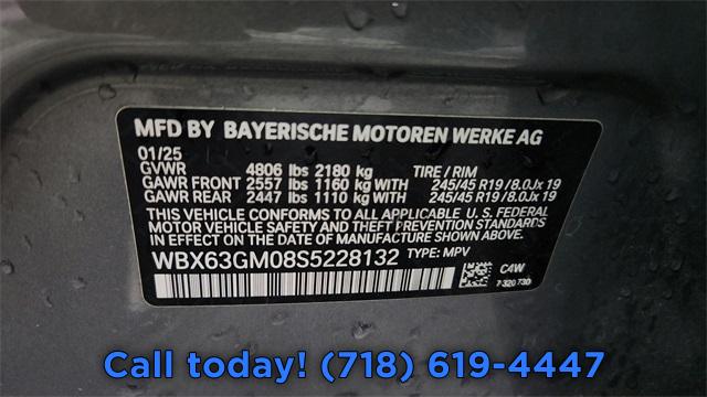 Navigation, Navigation System, 7 Speakers, AM/FM Radio, AM/FM radio: SiriusXM, Radio data system, SiriusXM w/360L & 1 Yr Platinum Plan Subscription, Air Conditioning, Automatic temperature control, Front dual zone A/C, Rear window defroster, Memory seat, Power driver seat, Power steering, Power windows, Remote keyless entry, Steering wheel mounted audio controls, Four wheel independent suspension, Speed-sensing steering, Traction control, 4-Wheel Disc Brakes, ABS brakes, Dual front impact airbags, Dual front side impact airbags, Emergency communication system: BMW Assist eCall, Front anti-roll bar, Knee airbag, Low tire pressure warning, Occupant sensing airbag, Overhead airbag, Rear anti-roll bar, Sky Lounge Panoramic Roof, Power Liftgate, Brake assist, Electronic Stability Control, Exterior Parking Camera Rear, Auto High-beam Headlights, Delay-off headlights, Panic alarm, Security system, Speed control, Bumpers: body-color, Heated door mirrors, Power door mirrors, Spoiler, Turn signal indicator mirrors, Apple CarPlay & Android Auto Compatibility, BMW Assist eCall, BMW TeleServices, Compass, Driver door bin, Driver vanity mirror, Front reading lights, Illuminated entry, Leather steering wheel, Outside temperature display, Passenger vanity mirror, Personal eSIM 5G, Rear reading lights, Rear seat center armrest, Tachometer, Telescoping steering wheel, Tilt steering wheel, Trip computer, Widescreen Display, Front Bucket Seats, Front Center Armrest, Heated Front Seats, Heated front seats, Perforated Veganza Upholstery, Power Front Seats, Power passenger seat, Split folding rear seat, Passenger door bin, Alloy wheels, Wheels: 19" x 8.0" Y-Spoke Bicolor, Rain sensing wipers, Rear window wiper, Speed-Sensitive Wipers, Variably intermittent wipers