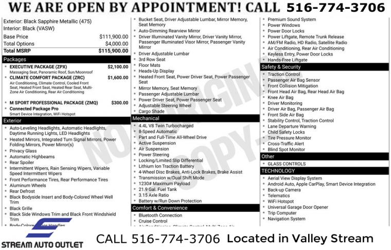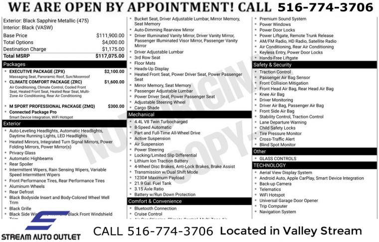 Navigation system: BMW Maps Navigation, Climate Comfort Package, Connected Package Pro, EXECUTIVE PKG, M Sport Package Pro, M Sport Professional Package, 16 Speakers, AM/FM radio: SiriusXM with 360L, AM/FM Stereo, harman/kardon Surround Sound System, harman/kardonĀ® Speakers, Radio data system, SiriusXM Satellite Radio, 5-Zone Automatic Climate Control, Air Conditioning, Automatic temperature control, Front dual zone A/C, Rear air conditioning, Rear dual zone A/C, Rear window defroster, Head restraints memory, Heads-Up Display, Memory seat, Power driver seat, Power steering, Power windows, Remote keyless entry, Steering wheel memory, Steering wheel mounted audio controls, Adaptive suspension, Auto-leveling suspension, Four wheel independent suspension, Speed-sensing steering, Traction control, 4-Wheel Disc Brakes, ABS brakes, Dual front impact airbags, Dual front side impact airbags, Emergency communication system: BMW Assist eCall, Front anti-roll bar, Knee airbag, Low tire pressure warning, M Sport Brakes w/Black Calipers, Occupant sensing airbag, Overhead airbag, Power adjustable front head restraints, Rear anti-roll bar, Panoramic Sky Lounge LED Roof, Power moonroof, Brake assist, Electronic Stability Control, Exterior Parking Camera Rear, Auto High-beam Headlights, Delay-off headlights, Fully automatic headlights, Panic alarm, Security system, Speed control, Auto-dimming door mirrors, Bumpers: body-color, Extended Shadowline Trim, Heated door mirrors, Power door mirrors, Spoiler, Turn signal indicator mirrors, Apple CarPlay & Android Auto Compatibility, Apple CarPlay Compatibility, Auto tilt-away steering wheel, Auto-dimming Rear-View mirror, BMW Assist eCall, BMW TeleServices, Compass, ConnectedDrive Services, Driver door bin, Driver vanity mirror, Front reading lights, Garage door transmitter, Genuine wood console insert, Genuine wood dashboard insert, Genuine wood door panel insert, Gesture Control, Glass Controls, Heated & Cooled Cup Holders, Heated Multi-Contour Seats, Heated steering wheel, Illuminated entry, Leather steering wheel, Live Cockpit Pro, Outside temperature display, Passenger vanity mirror, Personal eSIM 5G, Rear reading lights, Rear seat center armrest, Sport steering wheel, Tachometer, Telescoping steering wheel, Tilt steering wheel, Trip computer, Wireless Charging Device, 3rd row seats: split-bench, Extended Merino Leather Upholstery, Front & Rear Heated Seats, Front Bucket Seats, Front Center Armrest, Front Massaging Seats, Front Ventilated Seats, Heated front seats, Power Front Seats, Power passenger seat, Reclining 3rd row seat, Split folding rear seat, Passenger door bin, Alloy wheels, Wheels: 21" x 9.5" Dual-Spoke Bicolor Orbit Grey, Wheels: 22" x 9.5" Fr & 22" x 10.5" Rr Dual-Spoke, Rain sensing wipers, Rear window wiper, Speed-Sensitive Wipers, Variably intermittent wipers, 3.15 Axle Ratio, * NYS INSPECTION INCLUDED *, * FULL INTERIOR / EXTERIOR DETAIL *, * BLUETOOTH *, * LIMITED NYS LEMON LAW WARRANTY INCLUDED *, *FRESH OIL CHANGE *, * 150 MULTI POINT INSPECTION *