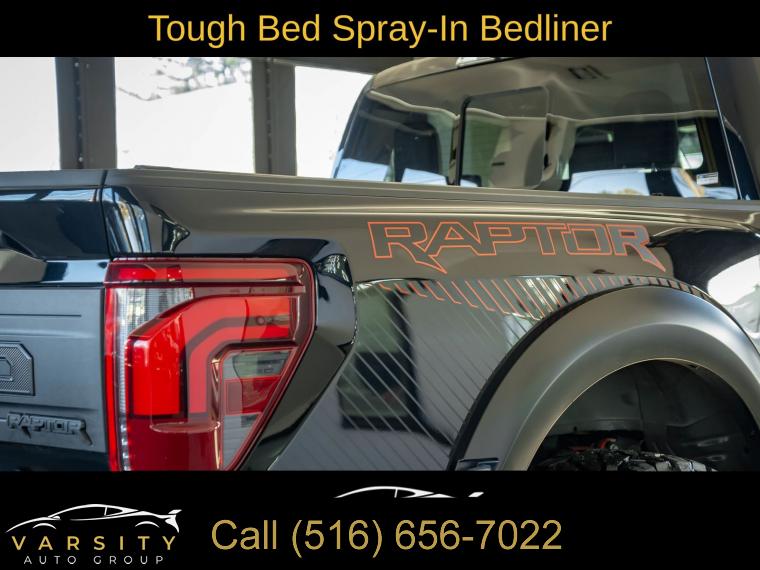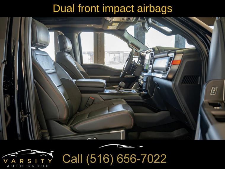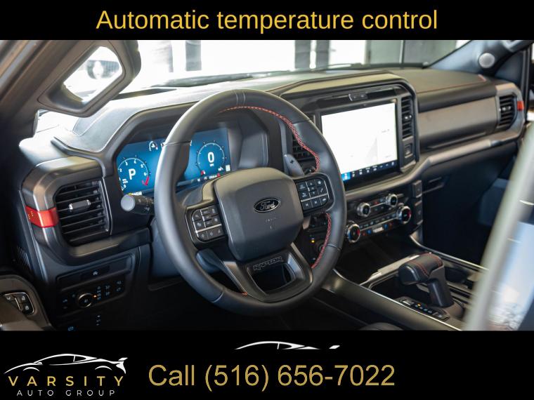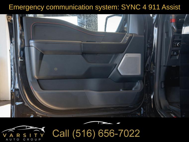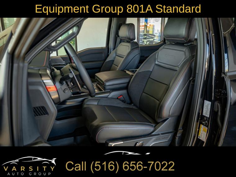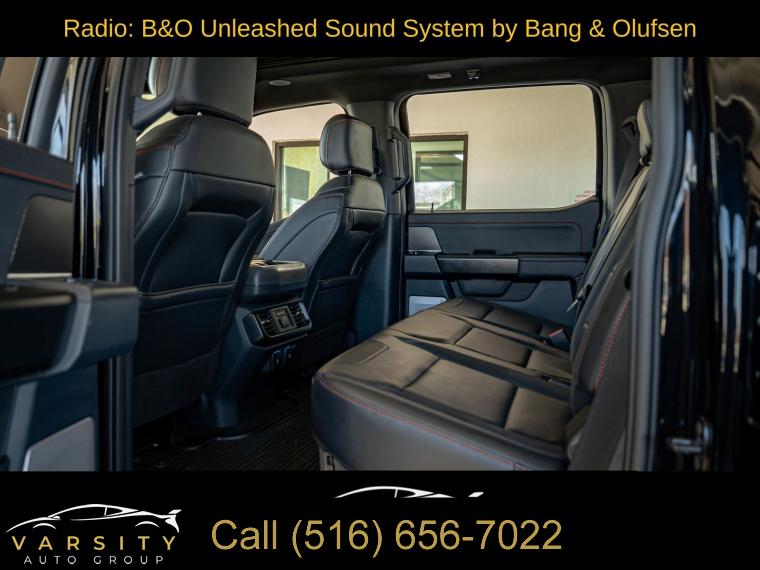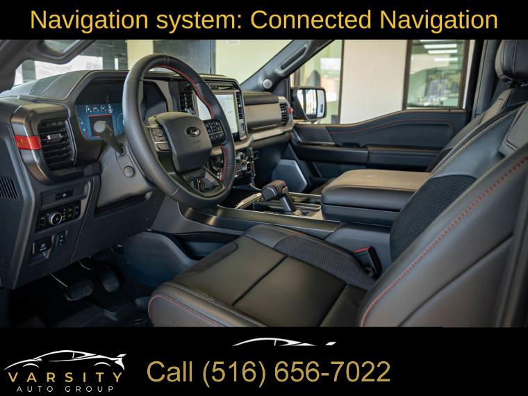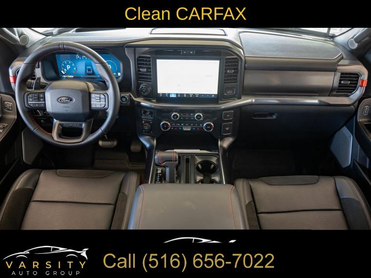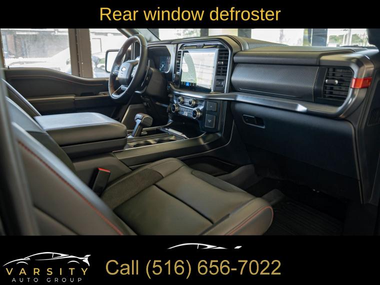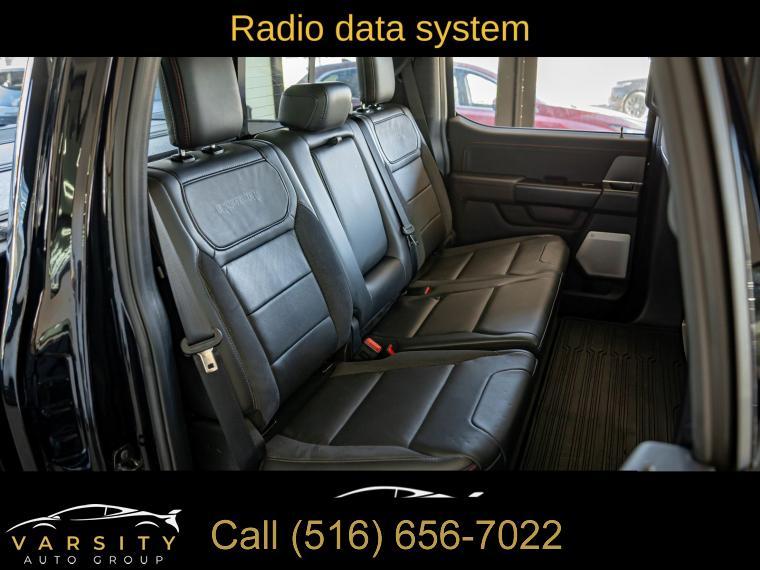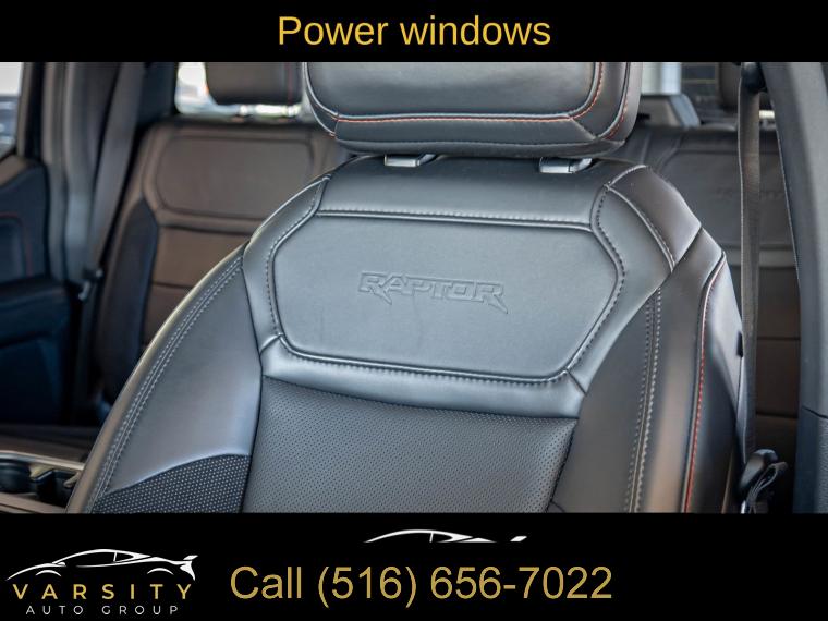 Navigation system: Connected Navigation, Equipment Group 801A Standard, 14 Speakers, AM/FM radio: SiriusXM with 360L, Radio data system, Radio: B&O Unleashed Sound System by Bang & Olufsen, Air Conditioning, Automatic temperature control, Front dual zone A/C, Rear window defroster, Heads-Up Display, Memory seat, Pedal memory, Power driver seat, Power steering, Power windows, Remote keyless entry, Steering wheel memory, Steering wheel mounted audio controls, Speed-sensing steering, Traction control, 4-Wheel Disc Brakes, ABS brakes, Dual front impact airbags, Dual front side impact airbags, Emergency communication system: SYNC 4 911 Assist, Front anti-roll bar, Front wheel independent suspension, Low tire pressure warning, Occupant sensing airbag, Overhead airbag, Twin Panel Moonroof, Tough Bed Spray-In Bedliner, Brake assist, Electronic Stability Control, Lane Departure Warning System, Auto High-beam Headlights, Delay-off headlights, Front fog lights, Fully automatic headlights, Panic alarm, Security system, Speed control, Auto-dimming door mirrors, Bumpers: body-color, Heated door mirrors, Power door mirrors, Rear step bumper, Turn signal indicator mirrors, Adjustable pedals, Auto tilt-away steering wheel, Auto-dimming Rear-View mirror, Compass, Driver door bin, Driver vanity mirror, Front reading lights, Heated steering wheel, Illuminated entry, Leather steering wheel, Outside temperature display, Overhead console, Passenger vanity mirror, Rear reading lights, SYNC 4 w/Enhanced Voice Recognition, Tachometer, Telescoping steering wheel, Tilt steering wheel, Trip computer, Front Bucket Seats, Front Center Armrest, Heated front seats, Heated rear seats, Leather Trimmed Seats, Power passenger seat, Split folding rear seat, Ventilated front seats, Passenger door bin, 17" Cast Aluminum Wheels, Alloy wheels, Rain sensing wipers, Variably intermittent wipers, Electronic Locking w/4.10 Axle Ratio, Ford F-150 Raptor, 4 wheel drive, Agate Black Metallic., Black Leather interior, 3.5L EcoBoost V6, Equipment Group 801A Standard., Clean CARFAX