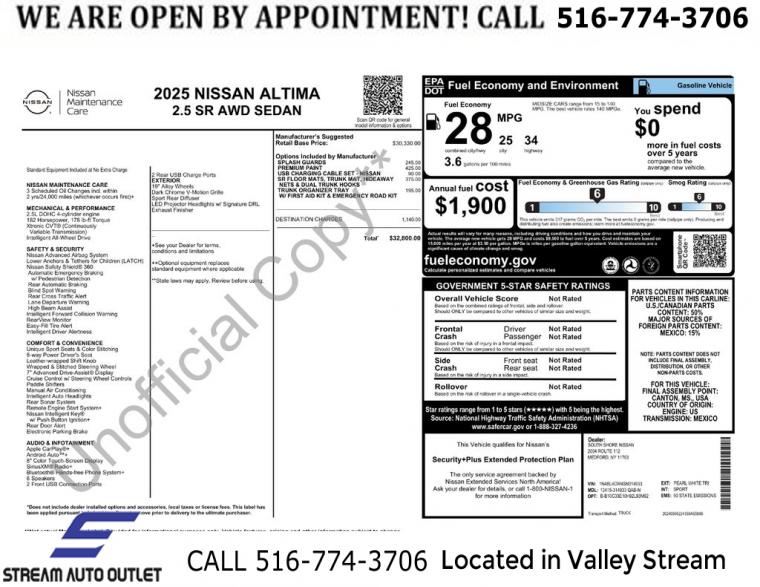 For more information on this 2025 Nissan Altima, please call Stream Auto Outlet Valley Stream at (516) 774-3706 or with the contact form on this page. This vehicle's vin number is 1N4BL4CW4SN314933 and is recorded as being in stock at Stream Auto Outlet Valley Stream at 324 W Merrick Rd in Valley Stream. See all cars from this dealership.