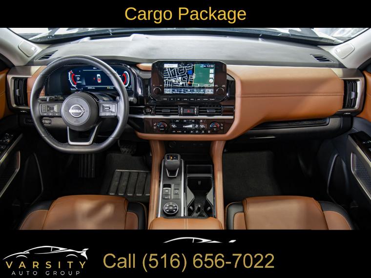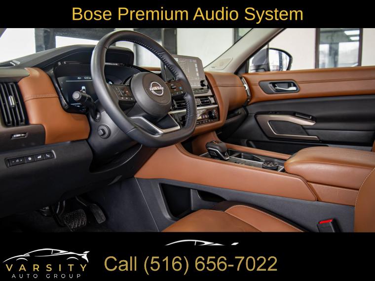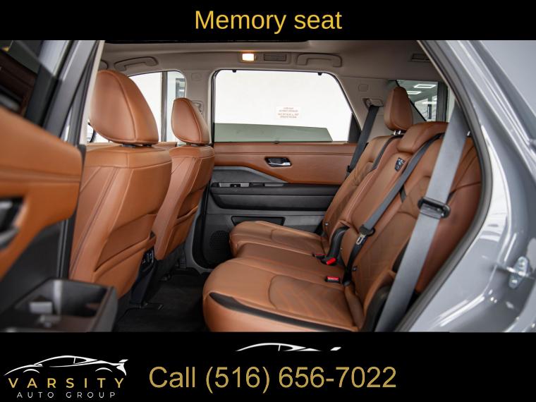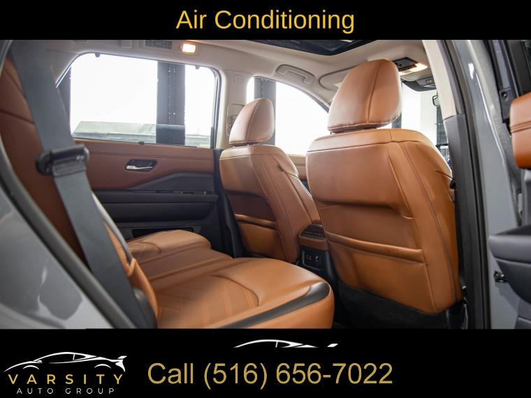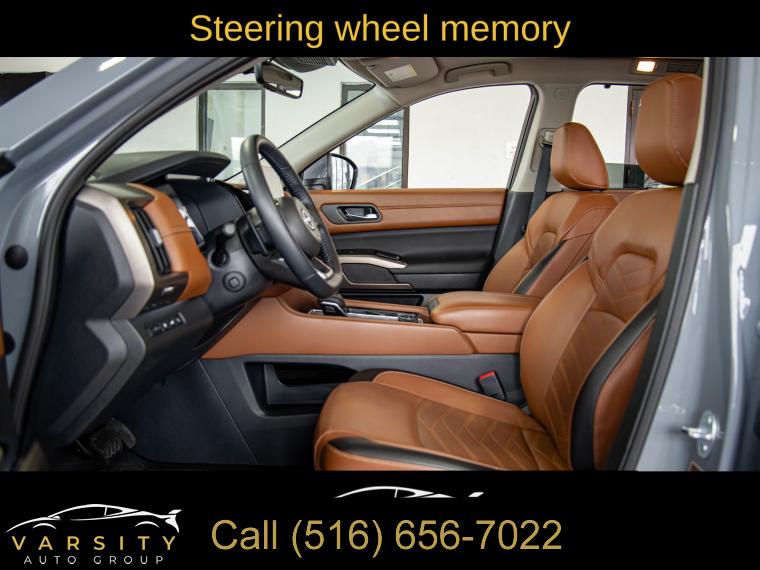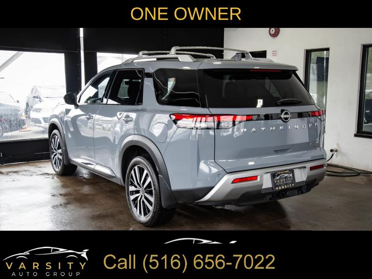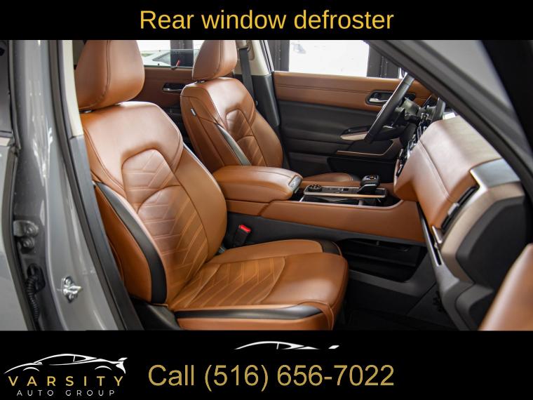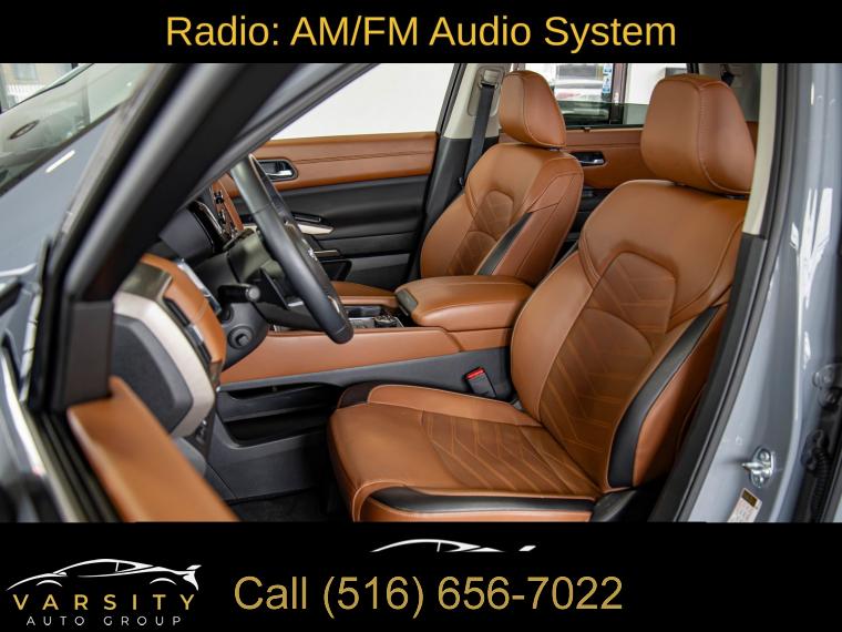 Navigation system: NissanConnect with Navigation and Services, Cargo Package, 13 Speakers, AM/FM radio: SiriusXM, Bose Premium Audio System, Radio data system, Radio: AM/FM Audio System, Air Conditioning, Automatic temperature control, Front dual zone A/C, Rear air conditioning, Rear window defroster, Heads-Up Display, Memory seat, Power driver seat, Power steering, Power windows, Remote keyless entry, Steering wheel memory, Steering wheel mounted audio controls, Cross Bars, Four wheel independent suspension, Speed-sensing steering, Traction control, 4-Wheel Disc Brakes, ABS brakes, Dual front impact airbags, Dual front side impact airbags, Emergency communication system, Front anti-roll bar, Knee airbag, Low tire pressure warning, Occupant sensing airbag, Overhead airbag, Rear anti-roll bar, Rear side impact airbag, Power moonroof, Power Liftgate, Brake assist, Electronic Stability Control, Exterior Parking Camera Rear, Auto High-beam Headlights, Delay-off headlights, Fully automatic headlights, First Aid, Panic alarm, Security system, Speed control, Black Splash Guards (set of 4), Bodyside moldings, Bumpers: body-color, Heated door mirrors, Power door mirrors, Premium Paint, Spoiler, Turn signal indicator mirrors, Auto tilt-away steering wheel, Auto-dimming Rear-View mirror, Bench Seat Carpeted Floor Mats (set of 4), Cargo Area Protector, Driver door bin, Driver vanity mirror, Front reading lights, Garage door transmitter: HomeLink, Heated steering wheel, Illuminated entry, Leather steering wheel, Nissan USB Charging Cable Set, NissanConnect featuring Apple CarPlay and Android Auto, NissanConnect with Navigation and Services, Outside temperature display, Overhead console, Passenger vanity mirror, Rear reading lights, Rear seat center armrest, Tachometer, Telescoping steering wheel, Tilt steering wheel, Trip computer, 3rd row seats: bench, Climate Controlled Front Bucket Seats, Front Bucket Seats, Front Center Armrest, Heated front seats, Heated rear seats, Power passenger seat, Reclining 3rd row seat, Semi-Aniline Leather-Appointed Seating Surfaces, Split folding rear seat, Ventilated front seats, Cargo Net, Passenger door bin, Alloy wheels, Wheels: 20" x 8J Machined Alloy, Rain sensing wipers, Rear window wiper, Speed-Sensitive Wipers, Variably intermittent wipers, 2025 Nissan Pathfinder Platinum, Boulder Gray Pearl, Chestnut w/Semi-Aniline Leather-Appointed Seating Surfaces, ONE OWNER