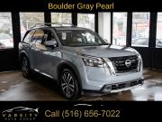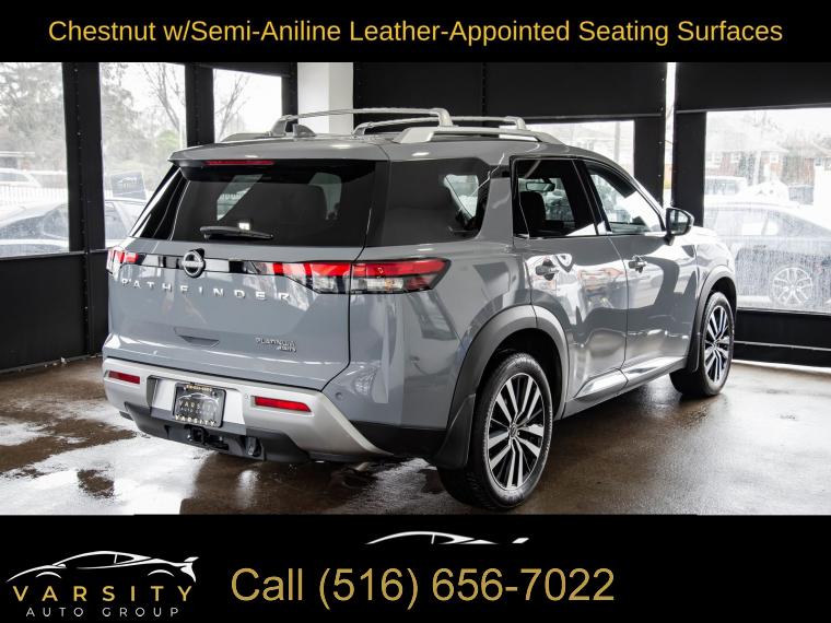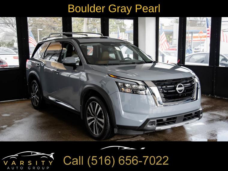 2025 Nissan Pathfinder Platinum, Boulder Gray Pearl, Chestnut w/Semi-Aniline Leather-Appointed Seating Surfaces, NissanConnect with Navigation and Services, ONE OWNER, 4WD, 13 Speakers, 3rd row seats: bench, 4-Wheel Disc Brakes, ABS brakes, Air Conditioning, Alloy wheels, AM/FM radio: SiriusXM, Auto High-beam Headlights, Auto tilt-away steering wheel, Auto-dimming Rear-View mirror, Automatic temperature control, Bench Seat Carpeted Floor Mats (set of 4), Black Splash Guards (set of 4), Bodyside moldings, Bose Premium Audio System, Brake assist, Bumpers: body-color, Cargo Area Protector, Cargo Net, Cargo Package, Climate Controlled Front Bucket Seats, Cross Bars, Delay-off headlights, Driver door bin, Driver vanity mirror, Dual front impact airbags, Dual front side impact airbags, Electronic Stability Control, Emergency communication system, Exterior Parking Camera Rear, First Aid, Four wheel independent suspension, Front anti-roll bar, Front Bucket Seats, Front Center Armrest, Front dual zone A/C, Front reading lights, Fully automatic headlights, Garage door transmitter: HomeLink, Heads-Up Display, Heated door mirrors, Heated front seats, Heated rear seats, Heated steering wheel, Illuminated entry, Knee airbag, Leather steering wheel, Low tire pressure warning, Memory seat, Navigation system: NissanConnect with Navigation and Services, Nissan USB Charging Cable Set, NissanConnect featuring Apple CarPlay and Android Auto, NissanConnect with Navigation and Services, Occupant sensing airbag, Outside temperature display, Overhead airbag, Overhead console, Panic alarm, Passenger door bin, Passenger vanity mirror, Power door mirrors, Power driver seat, Power Liftgate, Power moonroof, Power passenger seat, Power steering, Power windows, Premium Paint, Radio data system, Radio: AM/FM Audio System, Rain sensing wipers, Rear air conditioning, Rear anti-roll bar, Rear reading lights, Rear seat center armrest, Rear side impact airbag, Rear window defroster, Rear window wiper, Reclining 3rd row seat, Remote keyless entry, Security system, Semi-Aniline Leather-Appointed Seating Surfaces, Speed control, Speed-sensing steering, Speed-Sensitive Wipers, Split folding rear seat, Spoiler, Steering wheel memory, Steering wheel mounted audio controls, Tachometer, Telescoping steering wheel, Tilt steering wheel, Traction control, Trip computer, Turn signal indicator mirrors, Variably intermittent wipers, Ventilated front seats, Wheels: 20" x 8J Machined Alloy. Boulder Gray Pearl 2025 Nissan Pathfinder Platinum 4WD 9-Speed Automatic 3.5L V6 DOHC