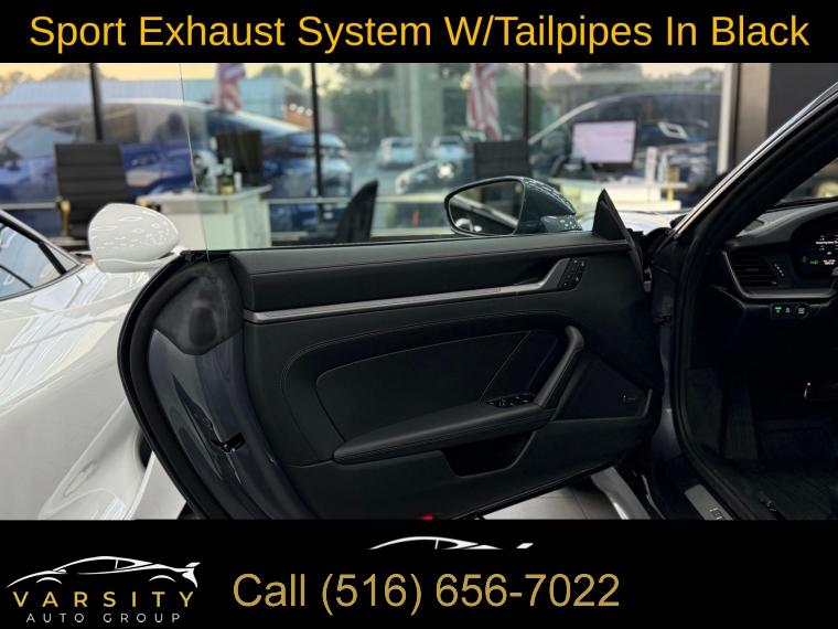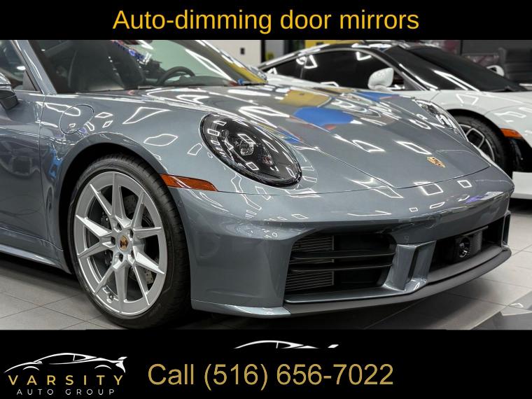 Navigation System, Navigation system: Porsche Communication Management (PCM), 14-Way Power Sport Seats w/Memory Package, Premium Package, Smoking Package, Sound Package Plus, Sport Chrono Package, 8 Speakers, BOSE Surround Sound System, Radio data system, Air Conditioning, Automatic temperature control, Front dual zone A/C, Ionizer, Rear window defroster, Porsche Communication Management, Power driver seat, Power steering, Power windows, Remote keyless entry, Steering wheel mounted audio controls, Adaptive suspension, Four wheel independent suspension, Front Axle Lift System, Heated GT Sport Steering Wheel in Leather (2PJ), Traction control, 4-Wheel Disc Brakes, ABS brakes, Dual front impact airbags, Dual front side impact airbags, Emergency communication system, Front anti-roll bar, Low tire pressure warning, Occupant sensing airbag, Overhead airbag, Rear anti-roll bar, Electric Slide/Tilt Glass Sunroof, SportDesign Front Fascia, Brake assist, Electronic Stability Control, Exterior Parking Camera Rear, Delay-off headlights, Fully automatic headlights, Rear fog lights, Security system, Adaptive Cruise Control, Speed control, Auto-dimming door mirrors, Bumpers: body-color, Exterior Mirror Lower Trim & Base in Ext Color, Heated door mirrors, Power door mirrors, Spoiler, Sport Exhaust System w/Tailpipes in Black, 4-Way Sport Seats, Aluminum Pedals & Footrest, Auto-dimming Rear-View mirror, Driver door bin, Driver vanity mirror, Front reading lights, Garage door transmitter: HomeLink, Heated steering wheel, Illuminated entry, Lane Change Assist (LCA), Leather steering wheel, Outside temperature display, Overhead console, Passenger vanity mirror, Porsche Crest on Front Headrests, Sport steering wheel, Surround View w/Active Parking Support, Tachometer, Telescoping steering wheel, Tilt steering wheel, Trip computer, Under Door Puddle Light Projectors, Front Bucket Seats, Front Center Armrest, Front Ventilated Seats, Heated front seats, Leather Seat Trim, Power passenger seat, Rear Seats, Extended Range 22.1 Gallon Fuel Tank, Passenger door bin, Preparation for Roof Transport System, Storage Net in Passenger Footwell, Wheel Center Caps w/Colored Porsche Crest, Wheels: 20" Front/21" Rear Carrera S, Rain sensing wipers, Variably intermittent wipers, 2025 Porsche 911 Carrera, Vanadium Grey Metallic, Black w/Leather Seat Trim, [P3K] Premium Package, [2D1] Sportdesign Package, Sport Exhaust System W/Tailpipes In Black, Heated GT Sport Steering Wheel In Leather (2 PJ), One Owner, Clean CARFAX