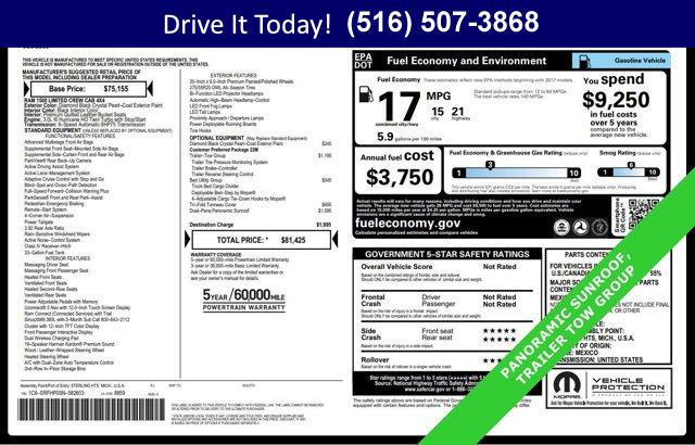 One owner. Diamond Black Crystal Pearlcoat exterior and Black interior, Limited trim. Heated Leather Seats, Sunroof, Navigation, 4x4, Turbo Charged, Bed Liner, Alloy Wheels, DUAL-PANE PANORAMIC SUNROOF , ENGINE: 3.0L I6 HURRICANE HO TWIN TUR. TRANSMISSION: 8-SPEED AUTOMATIC (8HP7. TRI-FOLD TONNEAU COVER, Trailer Hitch. Approx. Original Base Sticker Price: $75,200*.KEY FEATURES INCLUDELeather Seats, Navigation, 4x4, Heated Driver Seat, Heated Rear Seat.OPTION PACKAGESDUAL-PANE PANORAMIC SUNROOF LED Dome/Reading Lamp, Dome Dual LED Reading Lamp, TRI-FOLD TONNEAU COVER, TRANSMISSION: 8-SPEED AUTOMATIC (8HP75) (STD), ENGINE: 3.0L I6 HURRICANE HO TWIN TURBO ESS (STD). Ram Limited with Diamond Black Crystal Pearlcoat exterior and Black interior features a Straight 6 Cylinder Engine.VEHICLE REVIEWSGreat Gas Mileage: 21 MPG Hwy.OUR OFFERINGSWe hand select the finest automobiles possible, recondition as required so you do not have to worry about anything shortly down the road. Our Certified vehicles for example all have more than 50% brake life, most have brand new brakes installed front and rear and it does not end there.WESTBURY VIPAmericas #1 VIP Plus Program includes Complimentary Loaner Cars, UnlimitedOil & Filter changes for 1 yr. & then included with every factorymaintenance, Courtesy Shuttle to work, home or any other location, ExpressLube 30 minutes or less w/ no appointment necessary, Complimentary NYSI, 24/7 Rescue & Towing.