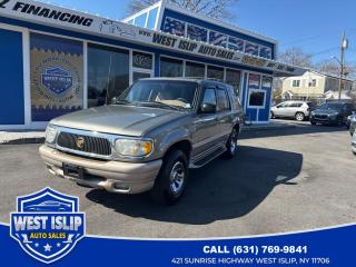 Comments Check out this 2000 MERCURY MOUNTAINEER AWD. Our advertised price is after 35% down.. This vehicle is ready for the road!Our network of banks ensures you that you can drive away regardless of your credit. Options 4-Speed A/T, ABS, 4-Wheel Disc Brakes, 8 Cylinder Engine, A/C, A/T, Adjustable Steering Wheel, All Wheel Drive, AM/FM Stereo, Power Outlet, Bucket Seats, Cargo Shade, Cassette, Child Safety Locks, Cruise Control, Driver Air Bag, Driver Illuminated Vanity Mirror, Driver Vanity Mirror, Fog Lamps, Floor Mats, Front Reading Lamps, Conventional Spare Tire, Gasoline Fuel, Intermittent Wipers, Leather Steering Wheel, Locking/Limited Slip Differential, Luggage Rack, Pass-Through Rear Seat, Passenger Air Bag, Passenger Illuminated Visor Mirror, Passenger Vanity Mirror, Power Door Locks, Power Mirror(s), Power Steering, Power Windows, Privacy Glass, Rear Bench Seat, Rear Defrost, Running Boards/Side Steps, Tires - Front All-Terrain, Tires - Rear All-Terrain, Variable Speed Intermittent Wipers, Engine Immobilizer, Black-out B-pillar treatment, Bright "waterfall" grille, Complex reflector headlights, Deep tinted privacy glass-inc: rear doors/quarter windows, liftgate window, Dual fold away pwr mirrors, Dual-setting intermittent rear window wiper/washer/defroster, Fog lamps integrated in front valence, Front/rear color-keyed bumper w/lower accent color, Hood/instrument panel sound insulation, Integrated body-color door handles, Medium platinum body-side moldings, One-piece top-hinged liftgate w/flip-open rear window, paddle-type handle, Roof rack, Running boards, Solar tinted windshield/front door windows, Speed-sensitive intermittent windshield wipers, Tri-color taillamps, Two-tone paint w/medium platinum lower accent color, (2) color-keyed coat hooks, (3) grab handles, (4) load floor tie-down hooks, 60/40 split folding rear seat w/headrests, Accessory delay feature (10 minutes), Additional 12-volt pwr point, Black cigarette lighter, Black leather-wrapped tilt steering wheel, Cargo area dome light, Cargo area pwr lock/unlock button for doors, Color-keyed A/B-pillar interior moldings, Color-keyed cowl side/rear quarter panel/liftgate interior moldings, Color-keyed door trim panels w/vinyl insert/carpeted lower portion/reflectors, Color-keyed full-length carpet, Color-keyed instrument panel, Color-keyed molded cloth headliner, Color-keyed plastic scuff plates w/"Mercury" logo on all doors & liftgate, Console-inc: armrest, storage bin, dual front/rear cupholders, Dual illuminated visor vanity mirrors, Electronic AM/FM stereo radio w/cassette-inc: (4) premium speakers, digital clock, Fingertip speed control-inc: tap up/tap down feature, Front dome/map light, Front door map pockets, Front/rear floor mats, Gauges-inc: fuel, coolant temp, voltmeter, oil pressure, Glove box w/color-keyed latch, Heater/defroster w/flow-through air ventilation, Instrumentation-inc: tachometer, analog speedometer, trip odometer, Manual day/night rearview mirror, Manual front air conditioning, Premium cloth captains chairs w/leather "Mountaineer" sewn into seatbacks, Pwr door locks-inc: illuminated controls, liftgate, Pwr windows-inc: illuminated controls, "one-touch-down" driver window, Rear window defroster, Retractable cargo cover, Reversible cargo mat, Securilock passive anti-theft system, Soft release parking brake, Warning chimes-inc: headlights-on, key-in-ignition & seat belt, 15" deep dish cast aluminum wheels, 21.0 gallon fuel tank, 2710# capacity front/3000# capacity rear springs, 2850# capacity front/3200# capacity rear axle, 3.73 axle ratio w/limited slip differential, 4-speed electronically-controlled automatic transmission w/OD, 4-wheel anti-lock braking system, 5.0L (302) OHV SMPI V8 engine, 72 amp/hr (650-CCA) maintenance-free battery w/battery saver feature (turns off dome/puddle lamps after 45 minutes), 95-amp alternator, Brake/shift interlock, Front/rear stabilizer bars, Full-time all-wheel drive transfer case, HD gas-charged shock absorbers, Hood-assist gas cylinders, Independent short & long arm front suspension w/torsion bars, Non-independent semi-floating rear suspension w/leaf springs, Overdrive lockout w/switch, P235/75R15 all-terrain SBR OWL tires, Pwr 4-wheel disc brakes, Pwr rack & pinion steering, Super engine cooling, Trailer towing pkg-inc: wiring harness, HD flasher, Underbody-mounted full-size spare tire w/15" steel wheel, 4-wheel anti-lock braking system, Brake/shift interlock, Driver & front passenger second generation airbags, Dual-note horn, Front 3-point adjustable-height safety belts, Rear door child-safety locks, Rear outboard lap/shoulder safety belts, Side door intrusion beams