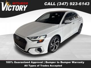 Comments Welcome to Victory Mitsubishi! We offer a combined inventory of 700 cars new and luxury used vehicles. All Used vehicles come with a quality assurance inspection, our New Vehicles have an unprecedented 10-year 100k mile warranty we also have vehicles car for any want or purpose. Come into test drive this car for any want or purpose. Come in to test drive this Audi A3 40 Premium today! Priced below KBB Fair Purchase Price! *. 2022 Audi A3 40 Premium quattro Glacier White 4D Sedan Save yourself Time and Money - Fill out a credit application online at victorymitsubishi.com and get pre-APPROVED! Financing available for all types of credit with low monthly payment that will fit you budget. Down Payment low as $599. Same day delivery. View our entire inventory by visiting our virtual showroom at victorymitsubishi.com - Only 2 blocks away from Exit 13 off I-95 or Minutes from exit 7 on the Hutchinson Parkway. While we make every effort to ensure the data listed here is correct, there may be instances where the pricing, options or vehicle features may be listed incorrectly. Dealer cannot be held liable for data that is listed incorrectly. to see more pictures of this vehicle or call us at (347) 923-6143 today to schedule your test drive. please refer to dealer’s website for exact pricing and for any incentives that we may apply! Our address is 4070 Boston Road, Bronx, NY 10475. * Options Wheels: 17" 5-Arm Design, Wheels: 18" 5-Y-Spoke Design, Heated Front Bucket Seats, Leather Seating Surfaces, Radio: Audi Sound System, Convenience Package, 18" Wheel Package, Audi Guard All-Weather Floor Mats, Alarm System w/Motion Sensor, Auto-Dimming Power Folding Exterior Mirrors, Auto-Dimming Interior Mirror w/Compass, Audi Advanced Key, Memory for Driver's Seat, Park Assist, Audi Side Assist, SiriusXM All Access Service, 4-Wheel Disc Brakes, Auto High-beam Headlights, Exterior Parking Camera Rear, Speed-Sensitive Wipers, Front beverage holders, Variably intermittent wipers, Turn signal indicator mirrors, Trip computer, Traction control, Tilt steering wheel, Telescoping steering wheel, Steering wheel mounted audio controls, Split folding rear seat, Speed-sensing steering, Speed control, Remote keyless entry, Rear window defroster, Rear seat center armrest, Rear reading lights, Rear fog lights, Rear anti-roll bar, Rear air conditioning, Rain sensing wipers, Radio data system, Power windows, Power steering, Power passenger seat, Power moonroof, Power driver seat, Power door mirrors, Passenger vanity mirror, Passenger door bin, Panic alarm, Overhead console, Overhead airbag, Outside temperature display, Occupant sensing airbag, Low tire pressure warning, Leather steering wheel, Knee airbag, Illuminated entry, Heated front seats, Heated door mirrors, Fully automatic headlights, Front reading lights, Front dual zone A/C, Front anti-roll bar, Four wheel independent suspension, Emergency communication system, Dual front side impact airbags, Dual front impact airbags, Driver vanity mirror, Driver door bin, Delay-off headlights, Bumpers: body-color, Brake assist, Automatic temperature control, Alloy wheels, AM/FM radio, ABS brakes, Tachometer, Front Center Armrest, Front Bucket Seats, Electronic Stability Control, Air Conditioning, 6 Speakers