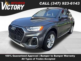 Comments Welcome to Victory Mitsubishi! We offer a combined inventory of 700 cars new and luxury used vehicles. All Used vehicles come with a quality assurance inspection, our New Vehicles have an unprecedented 10-year 100k mile warranty we also have vehicles car for any want or purpose. Come into test drive this car for any want or purpose. Come in to test drive this Audi Q5 45 S line Premium today! Priced below KBB Fair Purchase Price! *. CARFAX One-Owner. 2022 Audi Q5 45 S line Premium quattro Gray 4D Sport Utility Save yourself Time and Money - Fill out a credit application online at victorymitsubishi.com and get pre-APPROVED! Financing available for all types of credit with low monthly payment that will fit you budget. Down Payment low as $599. Same day delivery. View our entire inventory by visiting our virtual showroom at victorymitsubishi.com - Only 2 blocks away from Exit 13 off I-95 or Minutes from exit 7 on the Hutchinson Parkway. While we make every effort to ensure the data listed here is correct, there may be instances where the pricing, options or vehicle features may be listed incorrectly. Dealer cannot be held liable for data that is listed incorrectly. to see more pictures of this vehicle or call us at (347) 923-6143 today to schedule your test drive. please refer to dealer’s website for exact pricing and for any incentives that we may apply! Our address is 4070 Boston Road, Bronx, NY 10475. * Options 5.302 Axle Ratio, Wheels: 18" 5-Arm-Star Design, Heated 8-Way Power Front Bucket Seats, Leather Seating Surfaces, Radio: Audi Sound System, 4-Wheel Disc Brakes, Emergency communication system: Audi connect CARE, Auto High-beam Headlights, Exterior Parking Camera Rear, Compass, Speed-Sensitive Wipers, 10 Speakers, Auto-dimming Rear-View mirror, Variably intermittent wipers, Turn signal indicator mirrors, Trip computer, Traction control, Tilt steering wheel, Telescoping steering wheel, Steering wheel mounted audio controls, Split folding rear seat, Speed-sensing steering, Speed control, Security system, Remote keyless entry, Rear window wiper, Rear window defroster, Rear seat center armrest, Rear reading lights, Rear fog lights, Rear anti-roll bar, Rear air conditioning, Rain sensing wipers, Radio data system, Power windows, Power steering, Power passenger seat, Power driver seat, Power door mirrors, Passenger vanity mirror, Passenger door bin, Panic alarm, Overhead console, Overhead airbag, Outside temperature display, Occupant sensing airbag, Low tire pressure warning, Illuminated entry, Heated front seats, Heated door mirrors, Genuine wood door panel insert, Genuine wood dashboard insert, Genuine wood console insert, Garage door transmitter: HomeLink, Front reading lights, Front fog lights, Front dual zone A/C, Front anti-roll bar, Four wheel independent suspension, Dual front side impact airbags, Dual front impact airbags, Driver vanity mirror, Driver door bin, Delay-off headlights, Bumpers: body-color, Brake assist, Automatic temperature control, Alloy wheels, Adjustable head restraints: driver and passenger w/tilt, AM/FM radio, ABS brakes, Tachometer, Spoiler, Roof rack, Power Liftgate, Leather Shift Knob, Front Center Armrest, Front Bucket Seats, Electronic Stability Control, Air Conditioning