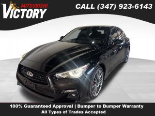 Comments Welcome to Victory Mitsubishi! We offer a combined inventory of 700 cars new and luxury used vehicles. All Used vehicles come with a quality assurance inspection, our New Vehicles have an unprecedented 10-year 100k mile warranty we also have vehicles car for any want or purpose. Come into test drive this car for any want or purpose. Come in to test drive this INFINITI Q50 Red Sport 400 today! Priced below KBB Fair Purchase Price! *. CARFAX One-Owner. Clean CARFAX. 2022 INFINITI Q50 Red Sport 400 Midnight Black 4D Sedan Save yourself Time and Money - Fill out a credit application online at victorymitsubishi.com and get pre-APPROVED! Financing available for all types of credit with low monthly payment that will fit you budget. Down Payment low as $599. Same day delivery. View our entire inventory by visiting our virtual showroom at victorymitsubishi.com - Only 2 blocks away from Exit 13 off I-95 or Minutes from exit 7 on the Hutchinson Parkway. While we make every effort to ensure the data listed here is correct, there may be instances where the pricing, options or vehicle features may be listed incorrectly. Dealer cannot be held liable for data that is listed incorrectly. to see more pictures of this vehicle or call us at (347) 923-6143 today to schedule your test drive. please refer to dealer’s website for exact pricing and for any incentives that we may apply! Our address is 4070 Boston Road, Bronx, NY 10475. * Options Wheels: 19" x 9" w/Exclusive Dark Finish, Heated Front Sport Seats, Quilted Semi-Aniline Leather-Appointed Seating, Radio: INFINITI InTouch w/Navigation, Radiant Grille Emblem, Splash Guards, Rear USB Charging Ports, Cargo Package, INFINITI Radiant Illuminated Kick Plates, INFINITI Radiant Welcome Lighting, ., First Aid Kit, Shopping Bag Hooks, Cargo Net, Trunk Mat, 4-Wheel Disc Brakes, Apple CarPlay/Android Auto, Emergency communication system: INFINITI Connection, Navigation system: INFINITI InTouch Navigation, Auto High-beam Headlights, AM/FM radio: SiriusXM, Compass, 16 Speakers, Speed-Sensitive Wipers, Auto-dimming Rear-View mirror, Blind Spot Warning, Front beverage holders, Variably intermittent wipers, Turn signal indicator mirrors, Trip computer, Traction control, Tilt steering wheel, Telescoping steering wheel, Steering wheel mounted audio controls, Steering wheel memory, Split folding rear seat, Speed control, Security system, Remote keyless entry, Rear window defroster, Rear seat center armrest, Rear reading lights, Rear anti-roll bar, Rain sensing wipers, Radio data system, Power windows, Power steering, Power passenger seat, Power moonroof, Power driver seat, Power door mirrors, Passenger vanity mirror, Passenger door bin, Panic alarm, Overhead console, Overhead airbag, Outside temperature display, Occupant sensing airbag, Memory seat, Low tire pressure warning, Leather steering wheel, Illuminated entry, Heated steering wheel, Heated front seats, Heated door mirrors, Garage door transmitter: HomeLink, Fully automatic headlights, Front reading lights, Front fog lights, Front dual zone A/C, Front anti-roll bar, Four wheel independent suspension, Dual front side impact airbags, Dual front impact airbags, Driver vanity mirror, Driver door bin, Delay-off headlights, CD player, Bumpers: body-color, Brake assist, Automatic temperature control, Auto-dimming door mirrors, Auto tilt-away steering wheel, Alloy wheels, Adaptive suspension, ABS brakes, Tachometer, Leather Shift Knob, Front Center Armrest, Front Bucket Seats, Electronic Stability Control, Air Conditioning