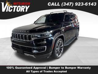 Comments Welcome to Victory Mitsubishi! We offer a combined inventory of 700 cars new and luxury used vehicles. All Used vehicles come with a quality assurance inspection, our New Vehicles have an unprecedented 10-year 100k mile warranty we also have vehicles car for any want or purpose. Come into test drive this car for any want or purpose. Come in to test drive this Jeep Wagoneer Series II today! Priced below KBB Fair Purchase Price! *. CARFAX One-Owner. 2022 Jeep Wagoneer Series II Diamond Black Crystal Pearlcoat 4D Sport Utility Save yourself Time and Money - Fill out a credit application online at victorymitsubishi.com and get pre-APPROVED! Financing available for all types of credit with low monthly payment that will fit you budget. Down Payment low as $599. Same day delivery. View our entire inventory by visiting our virtual showroom at victorymitsubishi.com - Only 2 blocks away from Exit 13 off I-95 or Minutes from exit 7 on the Hutchinson Parkway. While we make every effort to ensure the data listed here is correct, there may be instances where the pricing, options or vehicle features may be listed incorrectly. Dealer cannot be held liable for data that is listed incorrectly. to see more pictures of this vehicle or call us at (347) 923-6143 today to schedule your test drive. please refer to dealer’s website for exact pricing and for any incentives that we may apply! Our address is 4070 Boston Road, Bronx, NY 10475. * Options Quick Order Package 22J, 3.21 Rear Axle Ratio, Wheels: 20" x 9.0" Aluminum Base Finish, Wheels: 22" x 9.0" Premium 3 Aluminum (DISC), Leather Trimmed Bucket Seats, Normal Duty Suspension, Radio: Uconnect 5 Nav w/10.1" Display, Front Passenger Interactive Display, Premium Group I (DISC), Reversible Carpet/Vinyl Cargo Mat, Cargo Cover, 3 Panel Sunroof, Adjustable Roof Rail Crossbars, 4-Wheel Disc Brakes, AM/FM radio: SiriusXM with 360L, Exterior Parking Camera Rear, Driver's Seat Mounted Armrest, Front Center Armrest w/Storage, Compass, Speed-Sensitive Wipers, 10 Speakers, Auto-dimming Rear-View mirror, Ventilated front seats, Variably intermittent wipers, Turn signal indicator mirrors, Trip computer, Traction control, Tilt steering wheel, Telescoping steering wheel, Steering wheel mounted audio controls, Steering wheel memory, Split folding rear seat, Speed-sensing steering, Speed control, Security system, Remote keyless entry, Reclining 3rd row seat, Rear window wiper, Rear window defroster, Rear seat center armrest, Rear reading lights, Rear dual zone A/C, Rear anti-roll bar, Rear air conditioning, Rain sensing wipers, Radio data system, Power windows, Power steering, Power passenger seat, Power driver seat, Power door mirrors, Power adjustable front head restraints, Pedal memory, Passenger vanity mirror, Passenger seat mounted armrest, Passenger door bin, Panic alarm, Overhead console, Overhead airbag, Outside temperature display, Occupant sensing airbag, Memory seat, Low tire pressure warning, Knee airbag, Illuminated entry, Heated steering wheel, Heated front seats, Heated door mirrors, Genuine wood door panel insert, Genuine wood dashboard insert, Genuine wood console insert, Garage door transmitter, Fully automatic headlights, Front reading lights, Front fog lights, Front dual zone A/C, Front anti-roll bar, Four wheel independent suspension, Dual front side impact airbags, Dual front impact airbags, Driver vanity mirror, Driver door bin, Delay-off headlights, Bumpers: body-color, Brake assist, Automatic temperature control, Auto-leveling suspension, Auto-dimming door mirrors, Audio memory, Anti-whiplash front head restraints, Alloy wheels, Adjustable pedals, Adjustable head restraints: driver and passenger w/tilt, ABS brakes, 3rd row seats: bench, Voltmeter, Tachometer, Power Liftgate, Navigation System, Front Bucket Seats, Electronic Stability Control, Air Conditioning