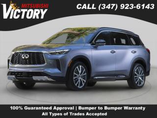 Comments Welcome to Victory Mitsubishi! We offer a combined inventory of 700 cars new and luxury used vehicles. All Used vehicles come with a quality assurance inspection, our New Vehicles have an unprecedented 10-year 100k mile warranty we also have vehicles car for any want or purpose. Come into test drive this car for any want or purpose. Come in to test drive this INFINITI QX60 LUXE today! *. Clean CARFAX. 2023 INFINITI QX60 LUXE Majestic White 4D Sport Utility Save yourself Time and Money - Fill out a credit application online at victorymitsubishi.com and get pre-APPROVED! Financing available for all types of credit with low monthly payment that will fit you budget. Down Payment low as $599. Same day delivery. View our entire inventory by visiting our virtual showroom at victorymitsubishi.com - Only 2 blocks away from Exit 13 off I-95 or Minutes from exit 7 on the Hutchinson Parkway. While we make every effort to ensure the data listed here is correct, there may be instances where the pricing, options or vehicle features may be listed incorrectly. Dealer cannot be held liable for data that is listed incorrectly. to see more pictures of this vehicle or call us at (347) 923-6143 today to schedule your test drive. please refer to dealer’s website for exact pricing and for any incentives that we may apply! Our address is 4070 Boston Road, Bronx, NY 10475. * Options 4.334 Axle Ratio, Wheels: 20" x 8J Sporty Machined Aluminum Alloy, Climate-Controlled Front Bucket Seats, Leather-Appointed Seating Surfaces, Radio: AM/FM Audio System, Splash Guards, Cargo Package, Floor Mats on Bench Seats w/3rd Row Tray, ., First Aid Kit, Cargo Mat (Reversible), 4-Wheel Disc Brakes, Navigation system: INFINITI InTouch Navigation, Auto High-beam Headlights, AM/FM radio: SiriusXM, Speed-Sensitive Wipers, Auto-dimming Rear-View mirror, Front beverage holders, Ventilated front seats, Variably intermittent wipers, Turn signal indicator mirrors, Trip computer, Traction control, Tilt steering wheel, Telescoping steering wheel, Steering wheel mounted audio controls, Steering wheel memory, Split folding rear seat, Speed-sensing steering, Speed control, Security system, Remote keyless entry, Reclining 3rd row seat, Rear window wiper, Rear window defroster, Rear side impact airbag, Rear seat center armrest, Rear reading lights, Rear anti-roll bar, Rear air conditioning, Rain sensing wipers, Radio data system, Power windows, Power steering, Power passenger seat, Power moonroof, Power driver seat, Power door mirrors, Passenger vanity mirror, Passenger door bin, Panic alarm, Overhead console, Overhead airbag, Outside temperature display, Occupant sensing airbag, Memory seat, Low tire pressure warning, Leather steering wheel, Knee airbag, Illuminated entry, Heated steering wheel, Heated front seats, Heated door mirrors, Garage door transmitter: HomeLink, Fully automatic headlights, Front reading lights, Front dual zone A/C, Front anti-roll bar, Four wheel independent suspension, Emergency communication system, Dual front side impact airbags, Dual front impact airbags, Driver vanity mirror, Driver door bin, Delay-off headlights, Bumpers: body-color, Brake assist, Automatic temperature control, Auto-dimming door mirrors, Anti-whiplash front head restraints, Alloy wheels, ABS brakes, 3rd row seats: bench, Tachometer, Spoiler, Power Liftgate, Leather Shift Knob, Front Center Armrest, Front Bucket Seats, Electronic Stability Control, Air Conditioning, 9 Speakers