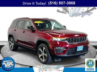 Comments One owner. Grand Cherokee 4xe trim, Velvet Red Pearlcoat exterior and Global Black interior. Heated Seats, Nav System, Moonroof, Power Liftgate, Panoramic Roof, 4x4, WHEELS: 20 X 8.5 MACHINED PAINTED A. ENGINE: 2.0L I4 DOHC DI TURBO PHEV, TRANSMISSION: 8-SPEED AUTOMATIC 8P75P. LUXURY TECH GROUP II, Turbo Charged Engine. Approx. Original Base Sticker Price: $60,500*.KEY FEATURES INCLUDENavigation, Sunroof, Panoramic Roof, 4x4, Power Liftgate.OPTION PACKAGESLUXURY TECH GROUP II Power Tilt/Telescope Steering Column, Integrated Off-Road Camera, Surround View Camera System, Rain Sensitive Windshield Wipers, ParkSense Front/Rear Park Assist w/Stop, Passive Entry - Front/Rear Doors, Liftgate, Wireless Charging Pad, Rear Back Up Camera Washer, Ventilated Front Seats, Auto Dim Exterior Driver Mirror, 2nd-Row Manual Window Shades, Intersection Collision Assist System, Rearview Autodim Digital Display Mirror, Memory Steering Column, WHEELS: 20 X 8.5 MACHINED PAINTED ALUMINUM Tires: 265/50R20 BSW A/S LRR, TRANSMISSION: 8-SPEED AUTOMATIC 8P75PH PHEV (STD), ENGINE: 2.0L I4 DOHC DI TURBO PHEV (STD). Jeep Grand Cherokee 4xe with Velvet Red Pearlcoat exterior and Global Black interior features a 4 Cylinder Engine with 375 HP at 5250 RPM*.BUY FROM AN AWARD WINNING DEALERWe hand select the finest automobiles possible, recondition as required so you do not have to worry about anything shortly down the road. Our Certified vehicles for example all have more than 50% brake life, most have brand new brakes installed front and rear and it does not end there.WESTBURY VIPAmericas #1 VIP Plus Program includes Complimentary Loaner Cars, UnlimitedOil & Filter changes for 1 yr. & then included with every factorymaintenance, Courtesy Shuttle to work, home or any other location, ExpressLube 30 minutes or less w/ no appointment necessary, Complimentary NYSI, 24/7 Rescue & Towing. Options TRANSMISSION: 8-SPEED AUTOMATIC 8P75PH PHEV (STD), GLOBAL BLACK CAPRI LEATHERETTE W/AXIS II SEATS, TIRES: 265/50R20 BSW A/S LRR, VELVET RED PEARLCOAT, WHEELS: 20 X 8.5 MACHINED PAINTED ALUMINUM -inc: Tires: 265/50R20 BSW A/S LRR, QUICK ORDER PACKAGE 27F -inc: Engine: 2.0L I4 DOHC DI Turbo PHEV Transmission: 8-Speed Automatic 8P75PH PHEV, ENGINE: 2.0L I4 DOHC DI TURBO PHEV (STD), LUXURY TECH GROUP II -inc: Power Tilt/Telescope Steering Column Integrated Off-Road Camera Surround View Camera System Rain Sensitive Windshield Wipers ParkSense Front/Rear Park Assist w/Stop Passive Entry - Front/Rear Doors Liftgate Wireless Charging Pad Rear Back Up Camera Washer Ventilated Front Seats Auto Dim Exterior Driver Mirror 2nd-Row Manual Window Shades Intersection Collision Assist System Rearview Autodim Digital Display Mirror Memory Steering Column, FRONT LICENSE PLATE BRACKET